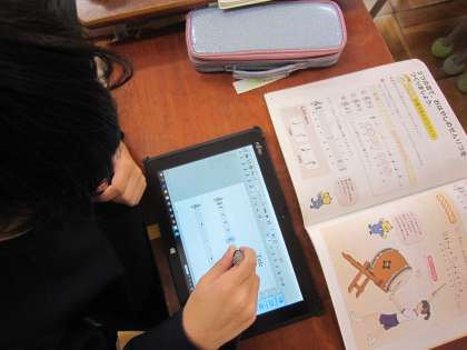 3年生の音楽の授業、タブレットの音楽ソフトを用いた曲づくりの様子です。
