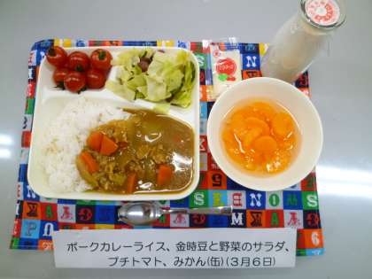 ポークカレーライスは大人気でした。金時豆と野菜のサラダは、マヨネーズをかけておいしくいただきました。お楽しみメニューは、みかん(缶)でした。さっぱりして甘くておいしかったです。