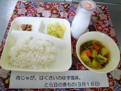 明日は豚肉の甘辛焼き、三色あげ天と野菜の煮もの、三度豆のごまあえの米飯献立です。今年度もあと3回の給食になりました。よく味わって食べましょう。