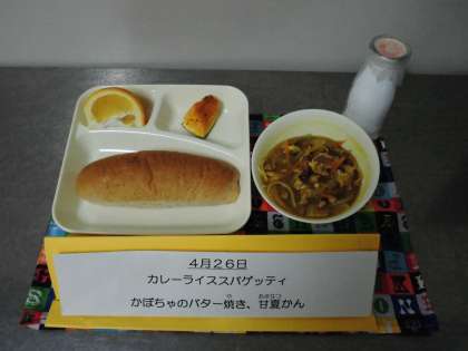 【らいむぎパン、牛乳、カレースープスパゲッティ、かぼちゃのバター焼き、甘夏かん】