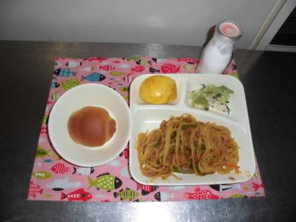【こくとうロール、牛乳、カレースパゲッティ—、キャベツのひじきドレッシング、河内ばんかん】