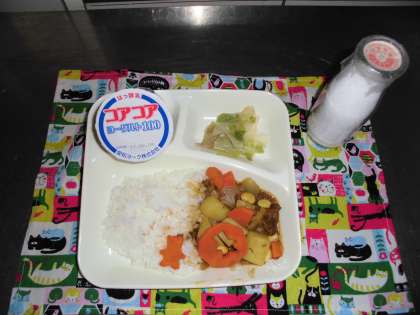 【牛肉と大豆のカレーライス、牛乳、レタスのサラダ、レタスのヨーグルト】