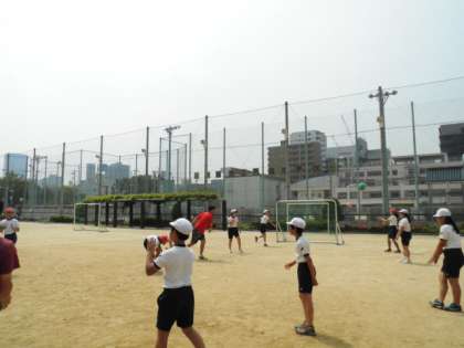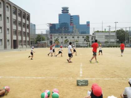 ボールの扱い方、パス、シュートを教えていただき練習をした後に、ゲームを行いました。