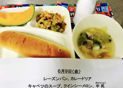 【レーズンパン、カレードリア、キャベツのスープ、クインシ—メロン】