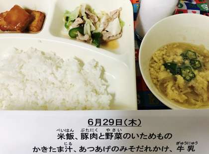 【米飯、牛乳、豚肉と野菜のいためもの、かきたま汁、あつあげのみそだれがけ】