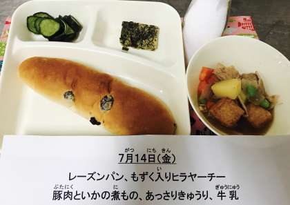 【レーズンパン、もずく入りヒラヤ—チー、豚肉といかの煮物、あっさりきゅうり、牛乳】