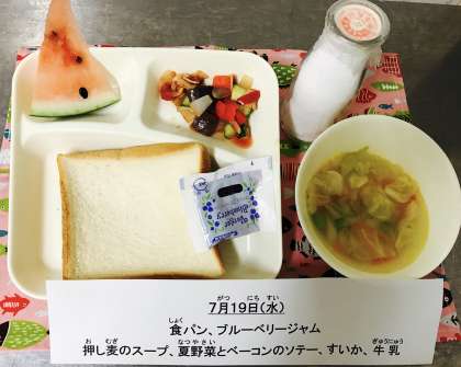 【食パン、ブルーベリージャム、押し麦のスープ、夏野菜とベーコンのソテー、すいか、牛乳】