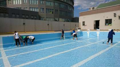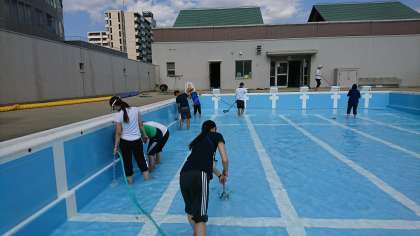 明日からの夏休みプール開放に備えて、職員でプール清掃を行いました。