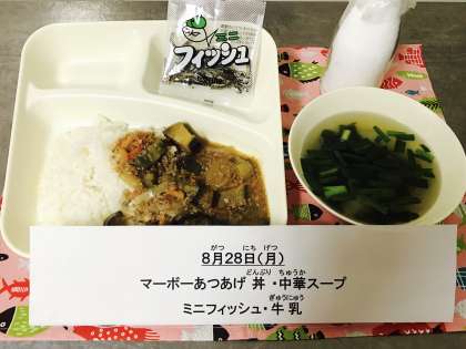 今日のこんだて【マーボーあつあげ丼、牛乳、中華スープ、ミニフィッシュ】