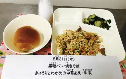 今日のこんだて【黒糖パン・牛乳・焼きそば・きゅうりとわかめの中華あえ】