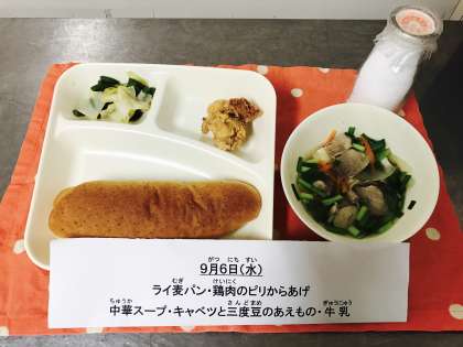 今日のこんだて【ライ麦パン、牛乳、鶏肉のピリからあげ、中華スープ、キャベツと三度豆のあえもの】