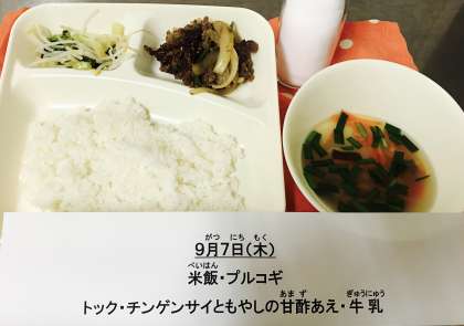 今日のこんだて【米飯、牛乳、プルコギ、トック、チンゲンサイともやしの甘酢あえ】