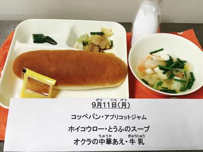 今日のこんだて【コッペパン、アプリコットジャム、ホイコウロー、とうふのスープ、オクラの中華あえ】