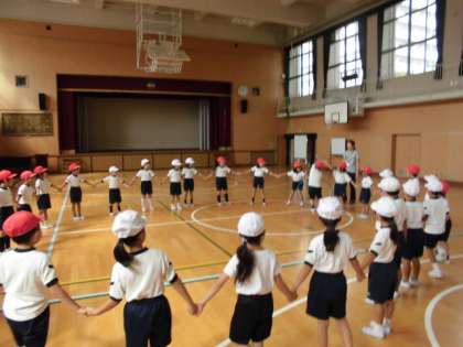 2組は、全員で手をつないでフラフープ送りをしました。みんなで声を掛け合い何秒で1周できるかチャレンジしていました。