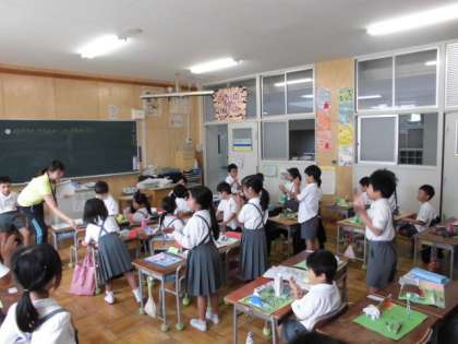3組は、図工で作った作品を鑑賞しいいところを伝いあいました。自分の作品のいいところを言ってもらい、恥ずかしそうにしている姿がかわいかったです。