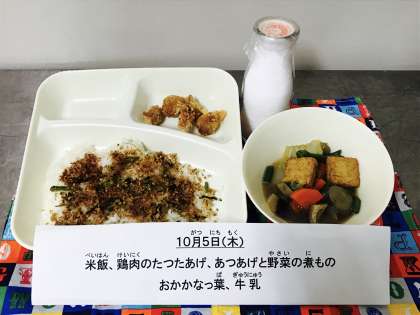 今日のこんだて【米飯、鶏肉のたつたあげ、あつあげと野菜の煮もの、おかかなっ葉、牛乳】