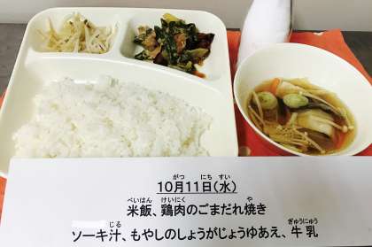 今日のこんだて【米飯、牛乳、鶏肉のごまだれ焼き、ソーキ汁、もやしのしょうがじょうゆあえ】