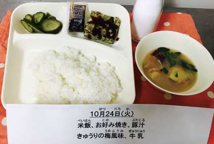 今日のこんだて【米飯、お好み焼き、豚汁、きゅうりの梅風味、牛乳】