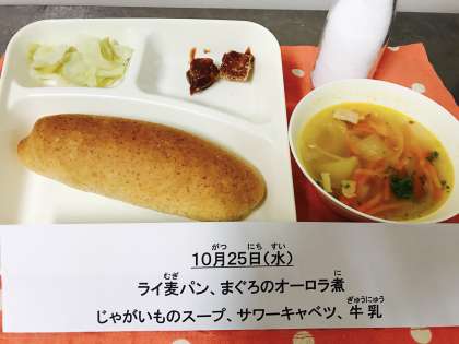 今日のこんだて【ライ麦パン、まぐろのオーロラ煮、じゃがいものスープ、サワーキャベツ、牛乳】