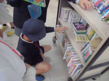 北図書館では、図書館についての話や絵本の読み聞かせを聞き、図書館内を見学しました。どこにどんな本があるのか、どんな種類の本があるのか、子どもたちは興味津々でした。