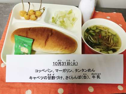 今日のこんだて【コッペパン、マーガリン、タンタンめん、キャベツの甘酢づけ、さくらんぼ(缶)、牛乳】