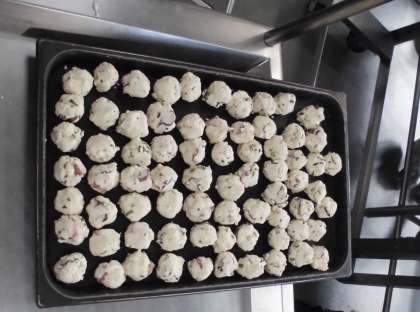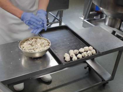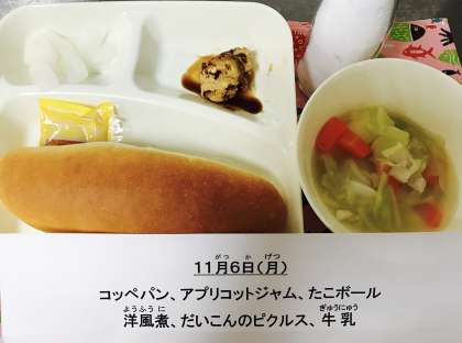 今日のたこボールは、たこ、とうふ、でんぷん、小麦粉、かつおぶし、青ねぎ、塩を混ぜ合わせ、調理員さんが1つずつ丸めて下さっています。全校分あわせると約500個です。丸めた後は油で揚げて、手作りソースをかけています。子どもたちに人気のこんだてです。