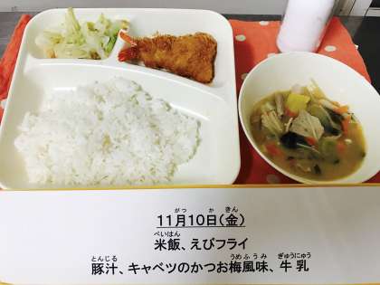今日のこんだて【米飯、えびフライ、豚汁、キャベツのかつお梅風味、牛乳】