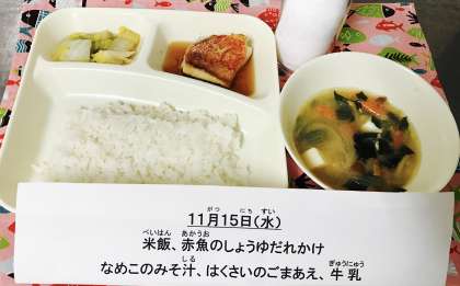 今日のこんだて【米飯、赤魚のしょうゆだれかけ、なめこのみそ汁、はくさいのごまあえ、牛乳】