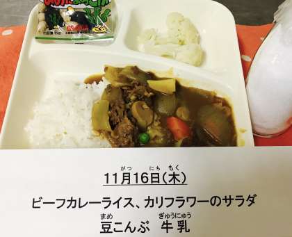 今日のこんだて【ビーフカレーライス、カリフラワーのサラダ、豆こんぶ、牛乳】