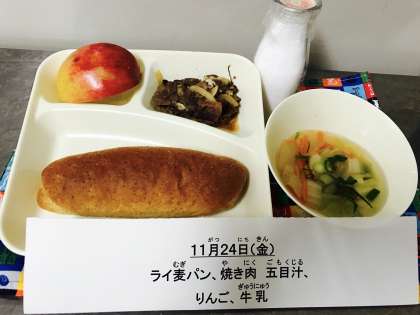 今日のこんだて【ライ麦パン、焼き肉、五目汁、りんご、牛乳】