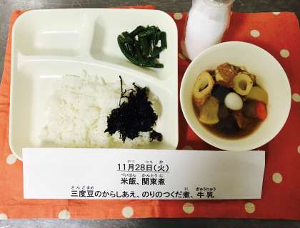 今日のこんだて【米飯、関東煮、三度豆のからしあえ、のりのつくだ煮、牛乳】
