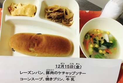 今日のこんだて【レーズンパン、豚肉のケチャップソテー、コーンスープ、焼きプリン、牛乳】