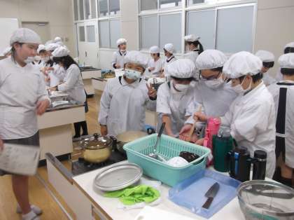 5年生で調理実習を行いました。作ったものは、ご飯とみそ汁です。班で協力して作ったメニューはとてもおいしく、笑顔が広がりました。安全に作れて、片づけもしっかりできてよかったです。