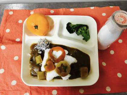 今日のこんだて【冬野菜のカレーライス、ブロッコリーのサラダ、みかん、牛乳】