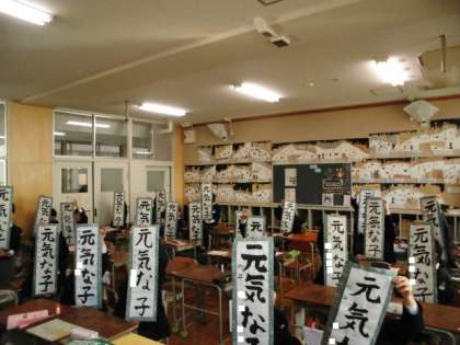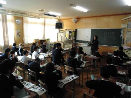 冬休みの宿題の書初めを台紙にはりました。みんな上手に書くことができました。
