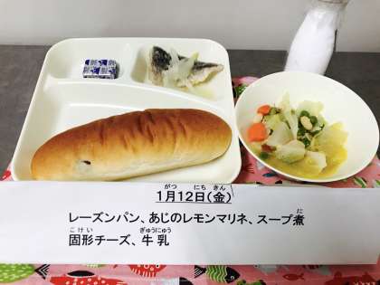 今日のこんだて【レーズンパン、あじのレモンマリネ、スープ煮、固形チーズ、牛乳】