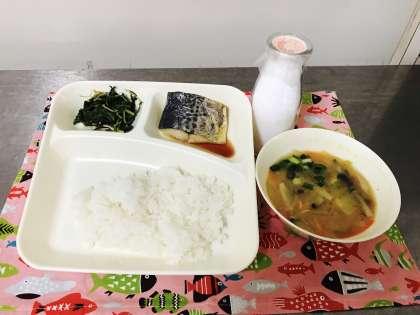 今日のこんだて【米飯、さごしのしょうゆだれかけ、みそ汁、みずなの煮びたし、牛乳】