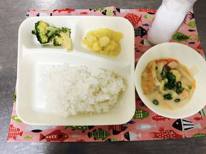 今日のこんだて【米飯、かす汁、ブロッコリーのごまあえ、くりきんとん】