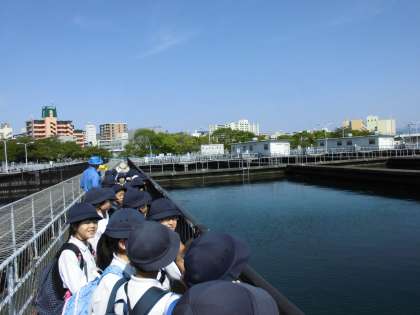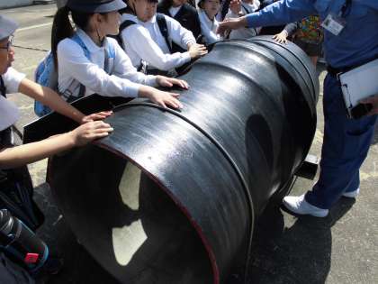 きれいな水をつくる浄水場。どうやって水をきれいにするのか、仕組みをくわしく教えてもらいました。また、浄水場からみんなの家に水を送っている水道管を見せてもらい、中に入れるほど大きな管にびっくりしていました。