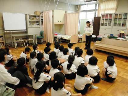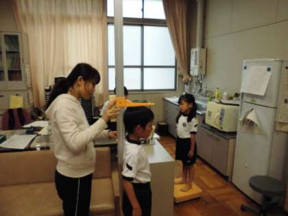 まずは、発育2測定。今日は身長と体重をはかりました。また、保健室を利用するときの注意も教えてもらいました。しっかりとお話を聞けましたね。