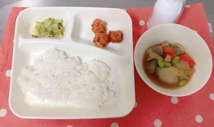 今日のこんだて【米飯、まぐろのオーロラ煮、さといもと野菜の含め煮、キャベツの梅風味、牛乳】