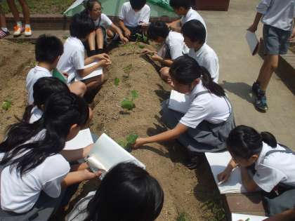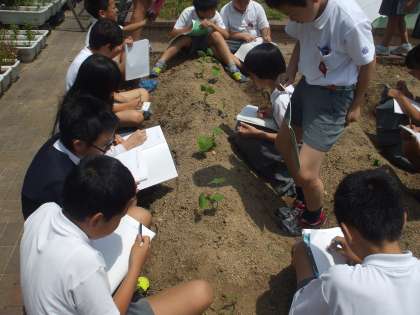 子ども達は、この暑い中でもしっかりと絵を描いたり、触ったり、匂いを嗅いだりじっくりと観察していました。その中で「青っぽい匂い!」や「ピーマンみたいな色」などと、伝統野菜に興味をもっているようです。