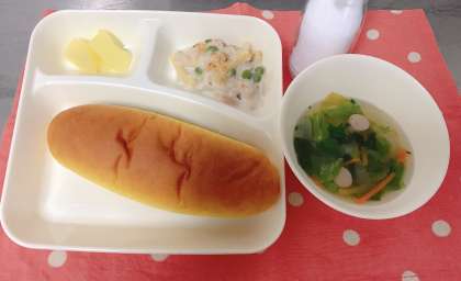 今日のこんだて【パンプキンパン、マカロニグラタン、レタスのスープ、りんご(缶)、牛乳】