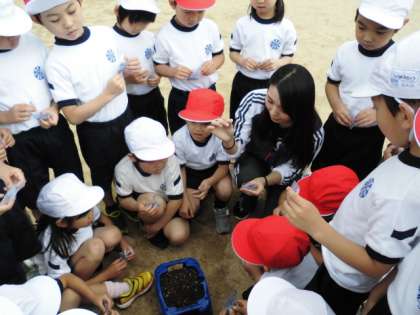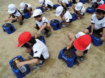 種の植え方やこやしの置き方をしっかりと聞いて、植えることができていました。早く芽が出るように、願いを込めて水もたっぷりとあげました。