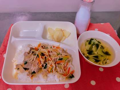 今日のこんだて【豚丼、ゆばのすまし汁、焼きじゃが、牛乳】
