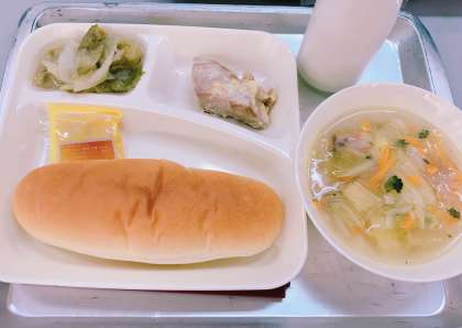 今日のこんだて【コッペパン、マーマレード、かつおのガーリックマヨネーズ焼き、スープ、レタスのサラダ、牛乳】