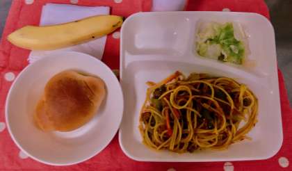 今日のこんだて【黒糖パン1/2、カレースパゲッティ、キャベツのサラダ、バナナ、牛乳】