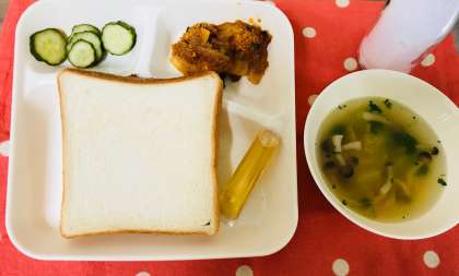 今日のこんだて【食パン、じゃがいものミートグラタン、スープ、きゅうりのピクルス】