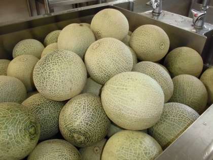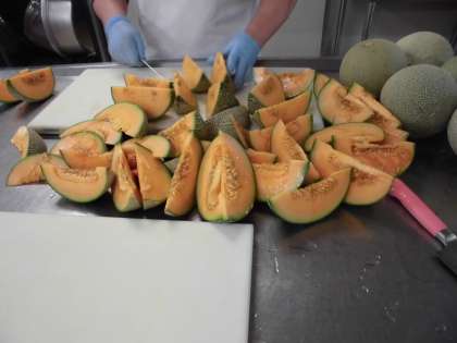 朝から調理室には64玉のクインシーメロンが届き、調理員さんが一つずつ手作業で切り分けて、種をとってくださっています。