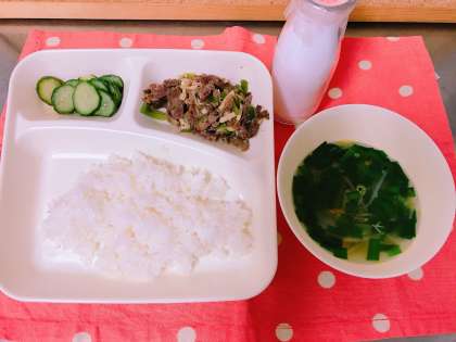 今日のこんだて【米飯、チンジャオニューロウスー、ハムと野菜の中華スープ、きゅうりの辛みづけ、牛乳】